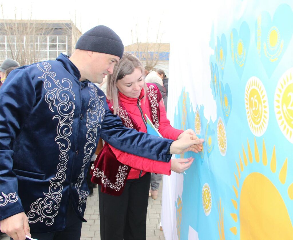 Одним из центральных моментов стало участие в патриотическом челлендже: у стелы установлен большой баннер с картой Казахстана, на который участники приклеили символические сердечки и оставили искренние пожелания нашей Родине.